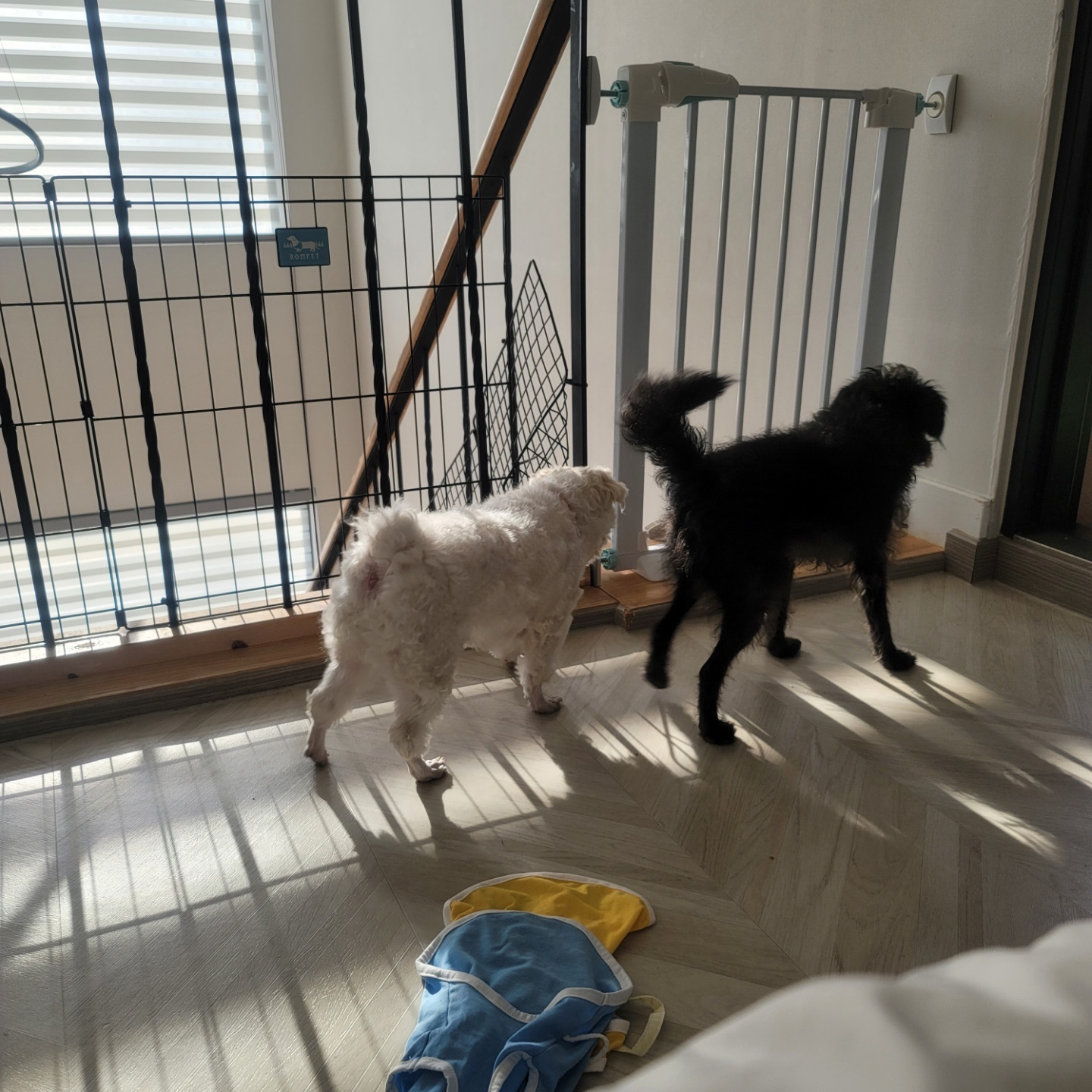 문을 열어 놓으면 자유롭게 나가서 배변할 수 있어서 편리하고, 강아지 입장에서는 답답한 방에 국한되지 않아서 좋았어요. 좀 더 나가고 싶어서 문을 닫고 있으면 긁힐 정도였다.