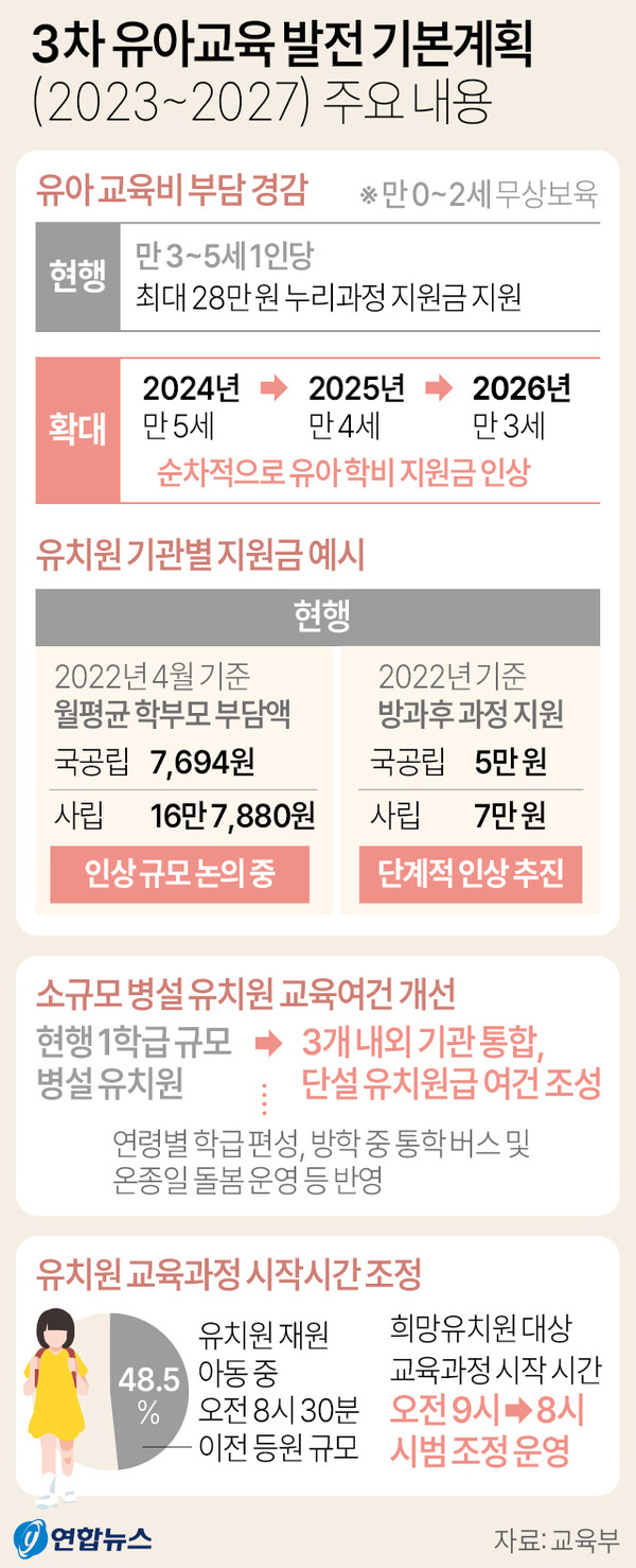 3~5세 유아를 대상으로 누리과정이 도입됨에 따라 유치원에는 국가공통교육과정(누리과정)이 적용되며, 보호자의 소득수준에 관계없이 전학년에 대해 보육료가 지원됩니다.