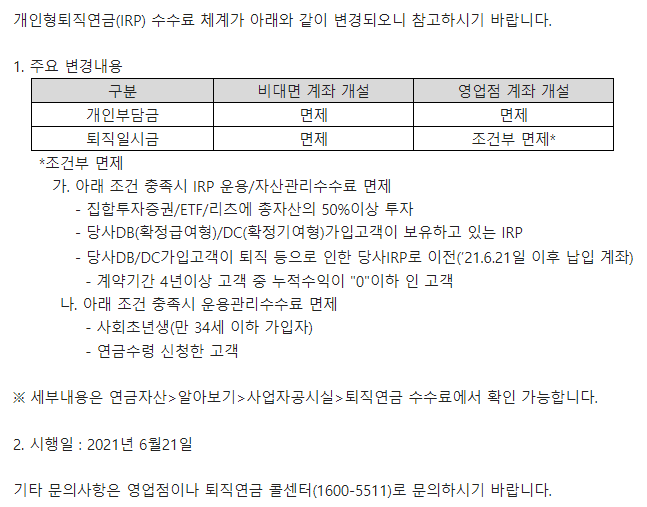 시행일은 2021년 6월 21일부터입니다. 비대면 계좌 개설 시에 한해 개인회생 및 연금 일시금 모두 수수료가 면제됩니다.활동 1: 스타벅스 아메리카노 쿠폰 1개 (1000추첨) 활동 2: 이체 또는 입금 활동